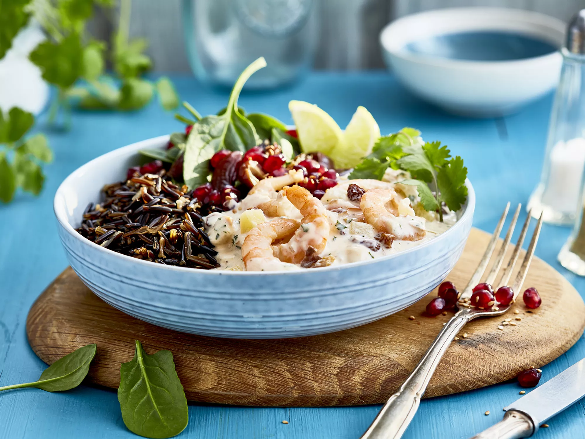 Wildreis, Spinat und Garnelesensalat mit Datteln und Limetten anrichten und mit Sesam, Koriander und Granatapfelkernen garnieren.
