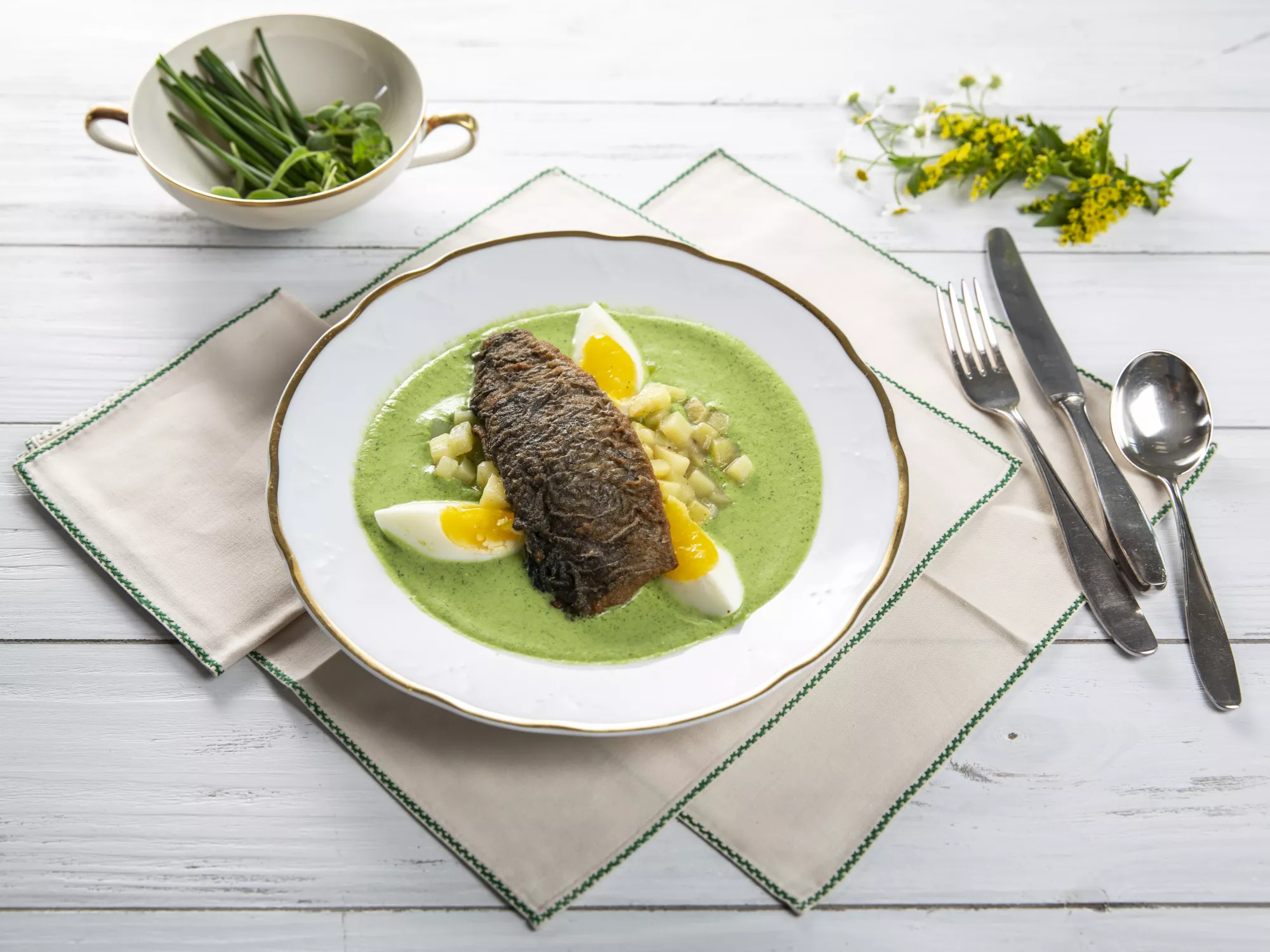 Kartoffeln in Würfel schneiden und mit Brunoise von 2 Schalotten anschwitzen. Mit Weißwein ablöschen und anschließend mit Gemüsebrühe auffüllen und garen bis die Kartoffel den richtigen Biss hat. Mit Salz, schwarzem Pfeffer aus der Mühle und Schmand abschmecken. Schnittlauch zugeben und in der Teller Mitte anrichten.