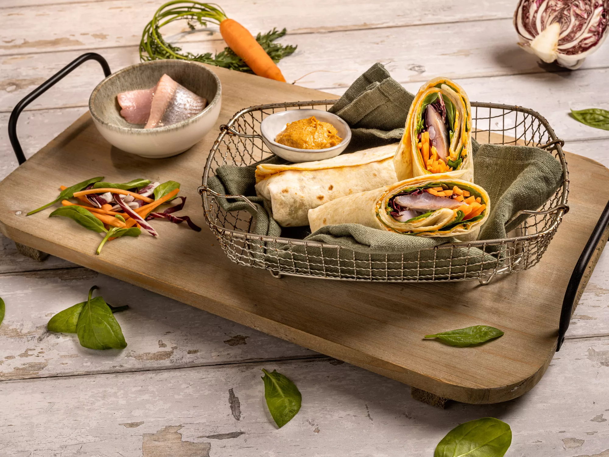 Den Spinat, den klein geschnittenen Rotkohl und die in Streifen geschnittenen Möhren verteilen.