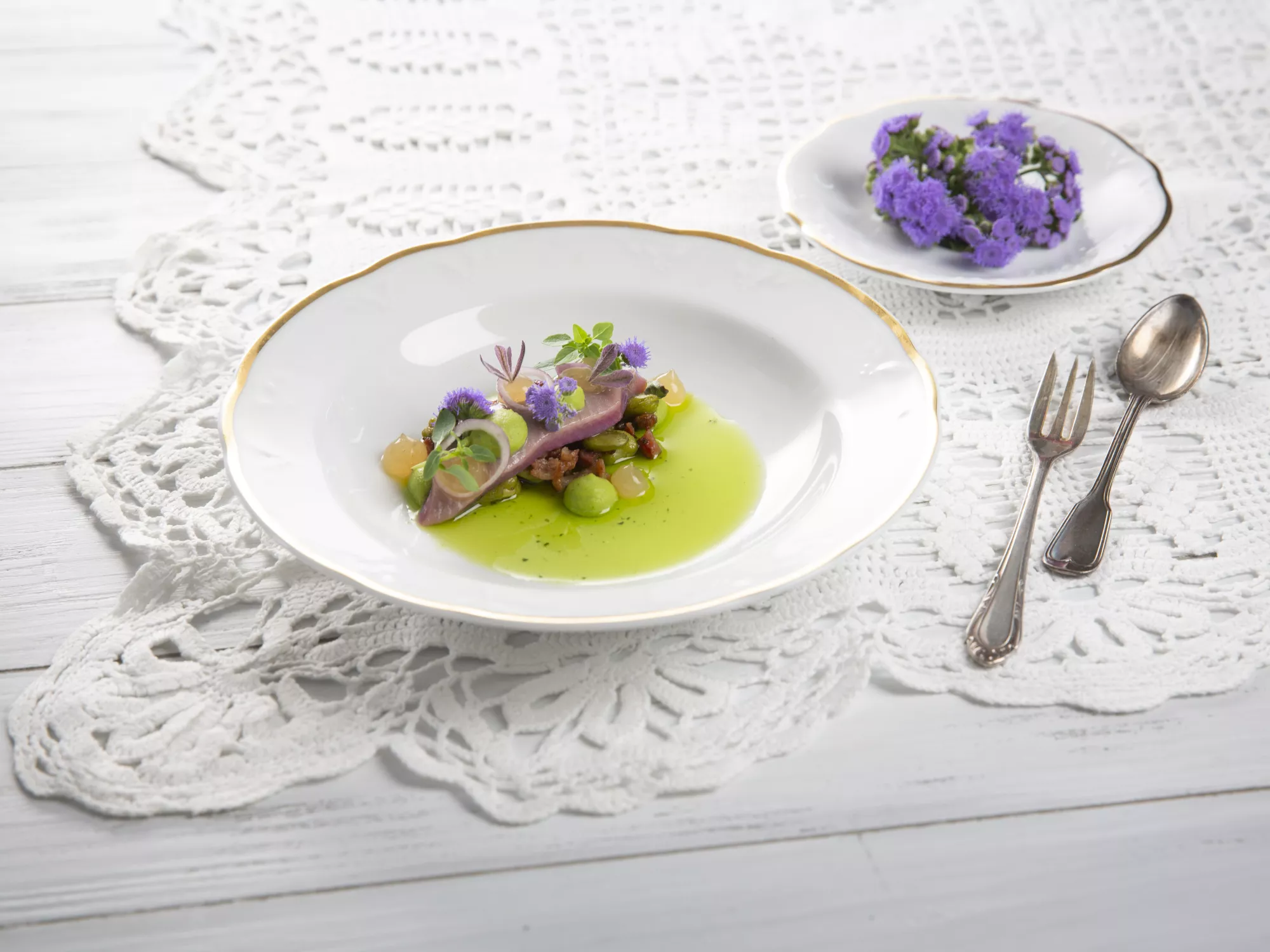 Anschließend mit Butter verfeinern, mit Salz und Pfeffer abschmecken und mit Bohnenkraut aromatisieren.